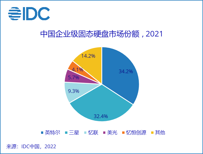 在越来越多的企业践行数字化优先战略的大背景下,中国企业级固态硬盘市场取得长足发展,2021年市场规模增长16.2%,达到32.8亿美元,约占全球市场的16.9%。英特尔和三星依托技术生态、供应链整合等能力要素处于主导地位,市场占比合计接近70%。忆联、忆恒创源、浪潮、大普微等本土厂商实力正在快速提升,发展势头强劲,有望改变当下相对稳定的市场格局。