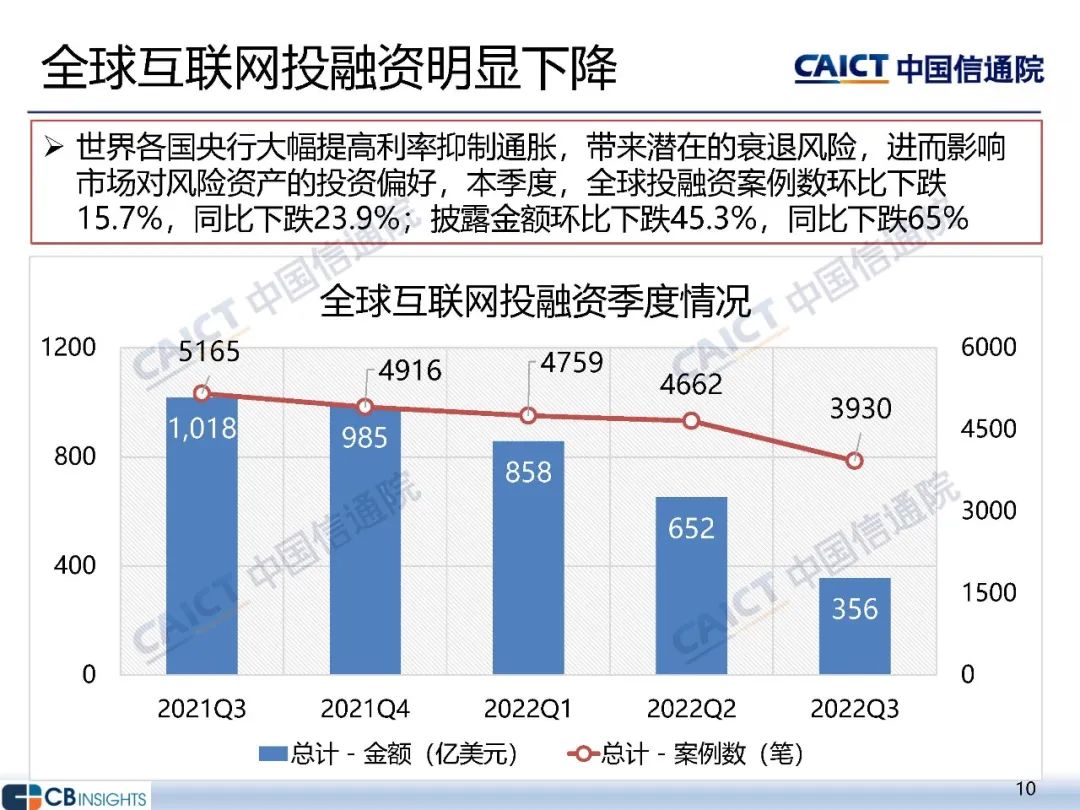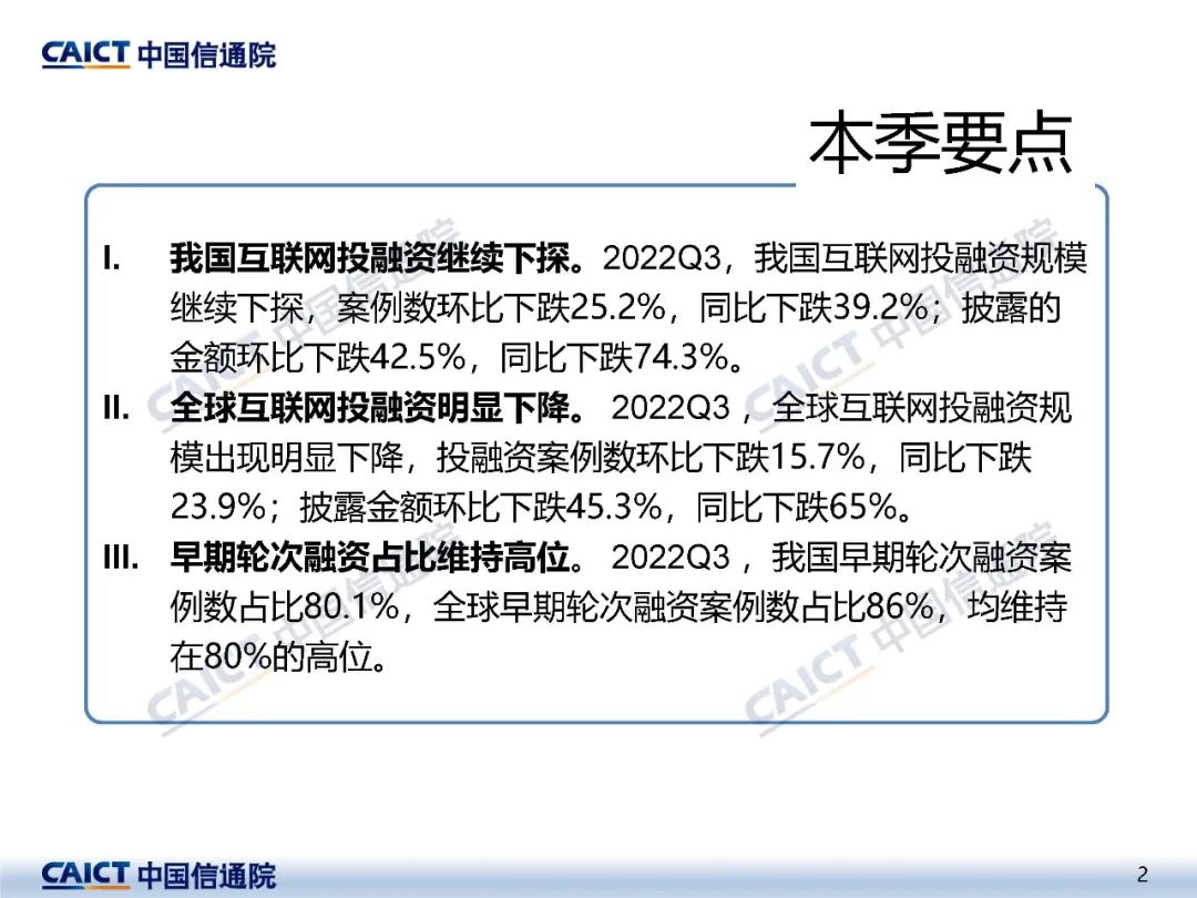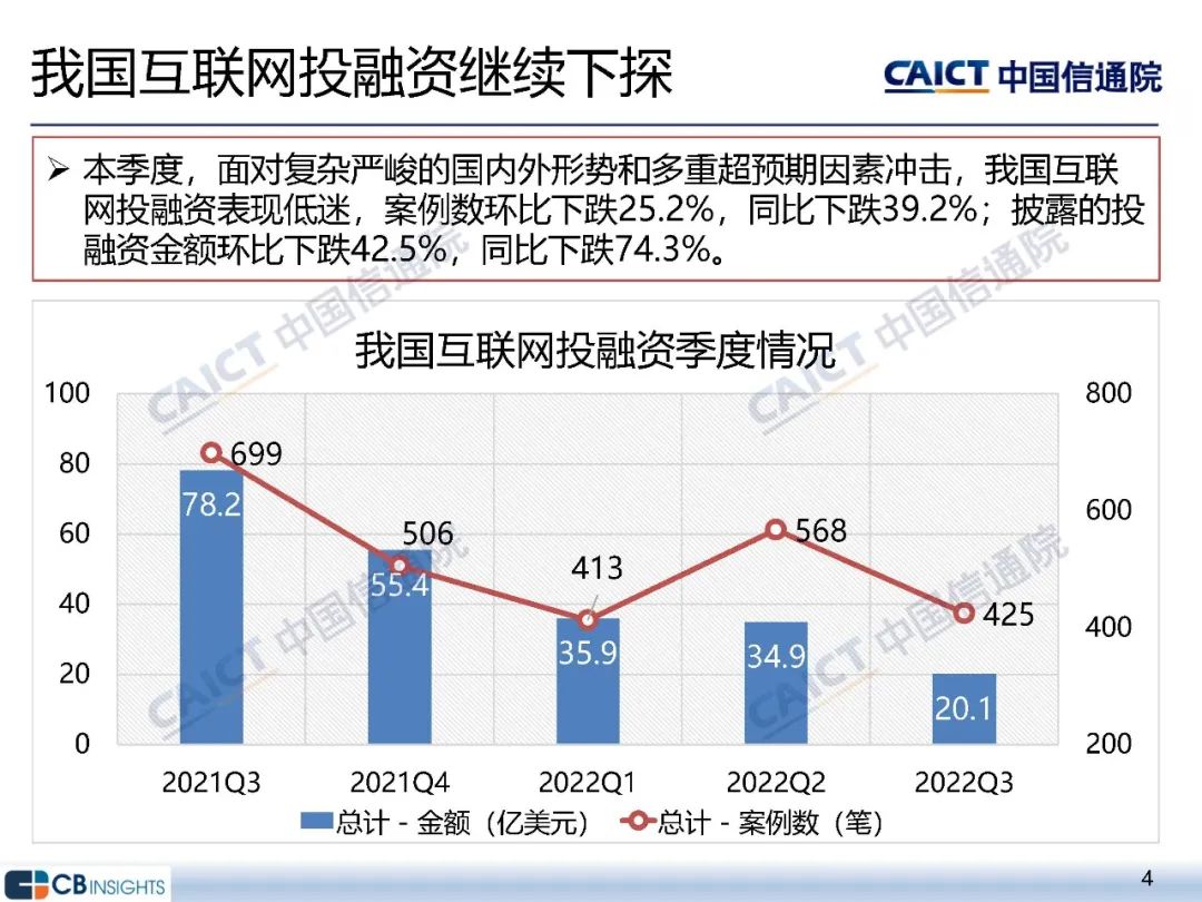 日前,中国信息通信研究院政策与经济研究所互联网运行分析团队发布了《2022年三季度互联网投融资运行情况》报告。