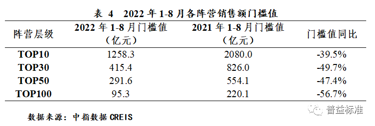 从销售端来看,行业基本面尚在磨底。2022年1-8月,TOP100门槛值为95.3亿元。其中,TOP10房企门槛值为1258.3亿元,较上年下降39.5%;TOP30房企门槛值为415.4亿元,较上年下降49.7%;TOP50房企及TOP100房企门槛值分别为291.6亿元和95.3亿元,同比分别下降47.4%和56.7%。销售收入是房企偿债的第一来源,房企偿债现金流恢复的前提是销售去化的持续性改善。本轮地产下行始于房企信用风险暴露,在2021年下半年逐渐蔓延至需求端,房企去化明显承压。从2022年上半年情况来看,房企销售仍难言乐观。
