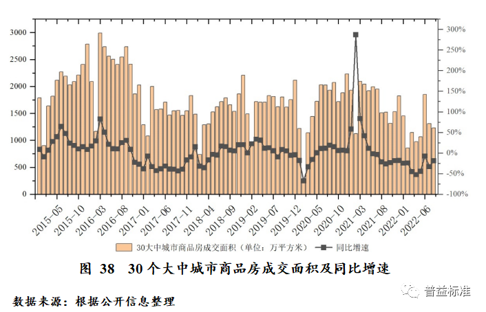 当前,我国的房地产调控政策仍未出现松绑迹象。在三道红线等房地产监管政策和调控政策的引导下,房地产投资属性不断弱化,“房住不炒”的理念逐渐深入人心。从30个大中城市商品房成交面积及同比增速来看,房地产市场的交易情况整体呈现“稳中有降”的态势,特别是进入2022年以来, 30个大中城市1-8月商品房成交面积始终保持着负增长。