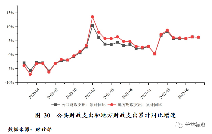 2022年以来,我国经济在内部新一轮疫情冲击、外部地缘政治危机和全球高通胀的复杂严峻环境之下,通过高效统筹疫情防控和经济社会发展,加大宏观政策调节力度,有效实施稳经济一揽子政策措施,努力使经济运行回归正常轨道。在中美利差缩窄背景下,公共财政支出和地方财政支出明显提速,财政政策发力有助于应对货币政策宽松的压力;截至2022年8月,公共财政支出和地方财政支出上半年累计同比增长均为6.3%。