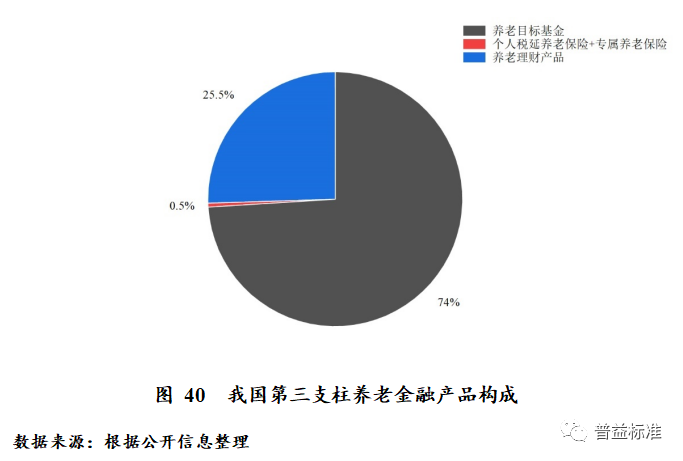 其中,养老目标基金占比约74%,截至2021年末,已成立174只养老目标基金,规模超过1151亿元,高于我国当前第三支柱中其他产品。个人税延养老保险+专属养老保险占比仅约0.5%,仍有较大的发展空间;截止2021年10月底,税延养老的资产规模累计实现保费收入6亿元,参保人数5万+;专属商业养老保险累计保费收入约2亿元,承保人数超过1.7万人。养老理财产品占比约25.5%,截至2022年一季度末,4家试点机构共发售16只养老理财产品,超过16.5万投资者累计认购约420亿元[16]。