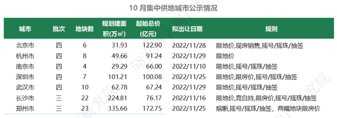 10月,集中供地22城中有7城推出地块,除了长沙和郑州推出的是第三批地块外,北京、杭州、南京、深圳、武汉推出第四批次地块,推出地块总量80幅,较前几批次规模上有较大幅度的下滑。而苏州、无锡早在9月份就公示了第四批地块,并于10月完成出让。