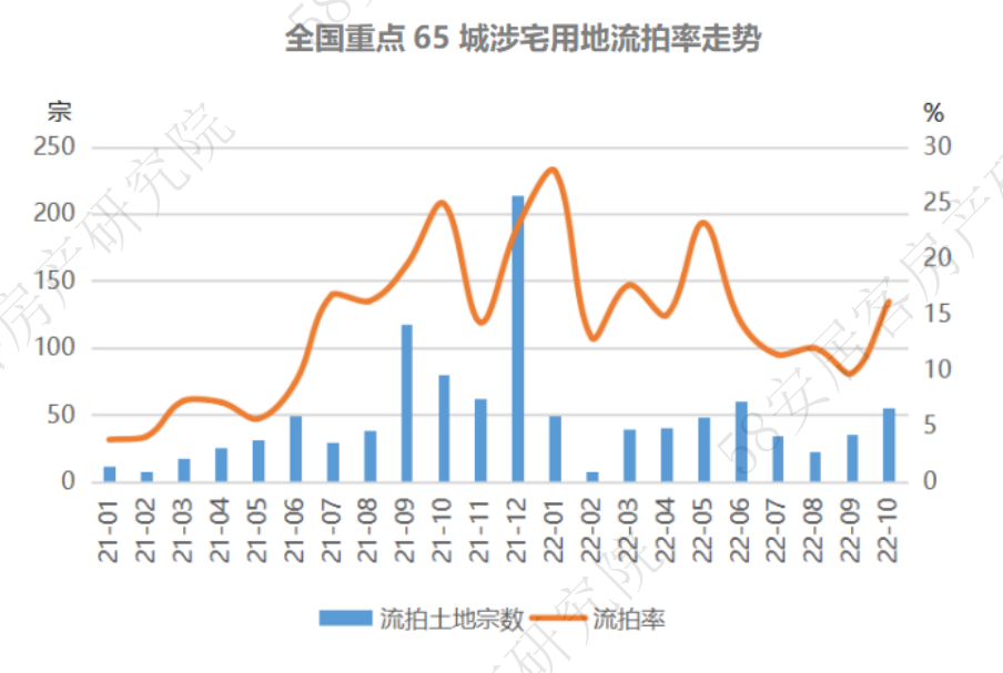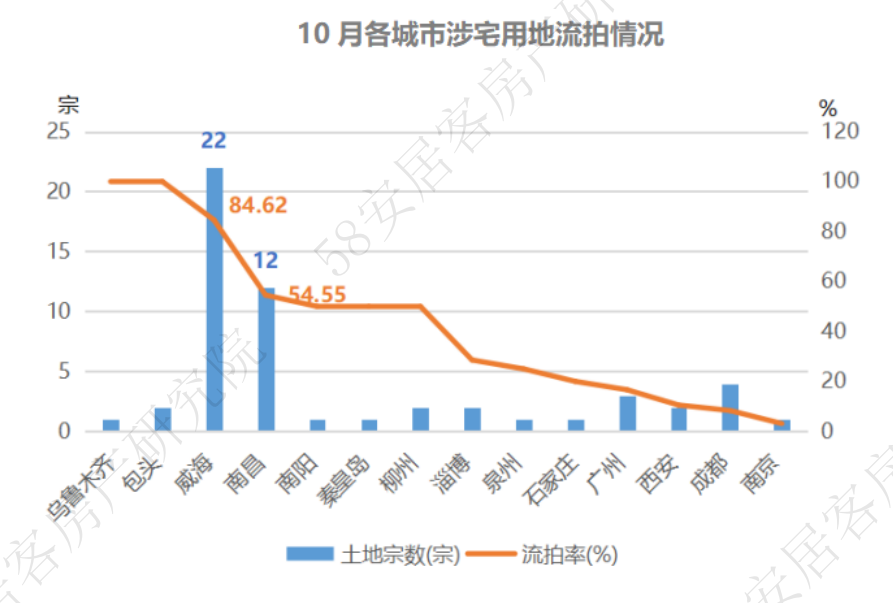 10月,全国重点65城宅地流拍55幅,流拍率为16.3%,较上月的9%有所增长,但总体低于去年第四季度水平。从10月流拍土地的所在城市看,涉及威海、南昌、成都等14个城市,其中,威海和南昌的流拍地块数分别达到22幅和12幅,流拍率也分别高达85%和55%。