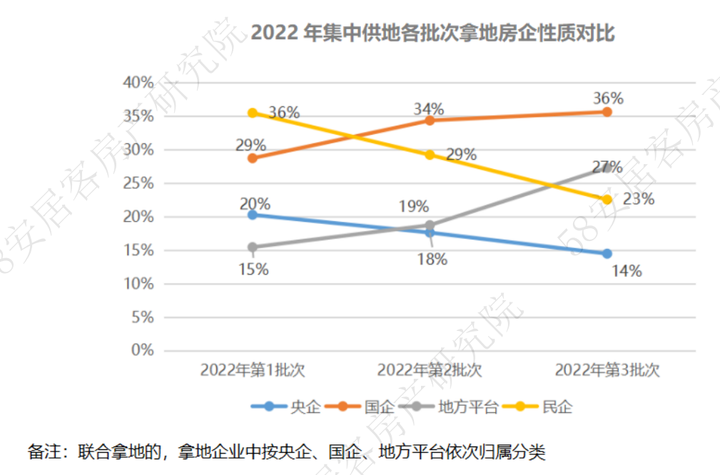 58安居客房产研究院分析师许之静指出,10月初,财政部发布《关于加强“三公”经费管理严控一般性支出的通知》,其中提及“不得通过国企购地等方式虚增土地出让收入”,这一举措在业内引起轰然,但实际上对于国企拿地并不会产生较大影响,只要拿地资金来源不属于财政拨款或是分期返还等,城投、城建等依旧是当下调整期拿地的主力。从今年以来的三批次拿地情况看,国企和地方平台拿地比重不降反增,由第一批次的分别占29%和15%,上升到第三批次的36%和27%。