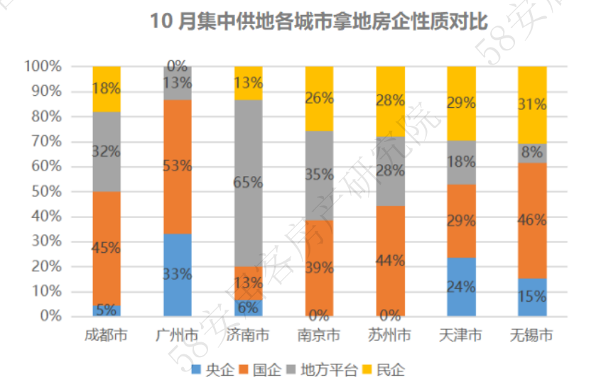 10月参与集中土拍的169幅地块依旧呈现央企、国企、地方平台托底的情况,各城民企拿地占比基本都在30%以下,广州在没有民企拿地的身影。济南则有65%的地块都有城投、城建等地方投资平台夺得。