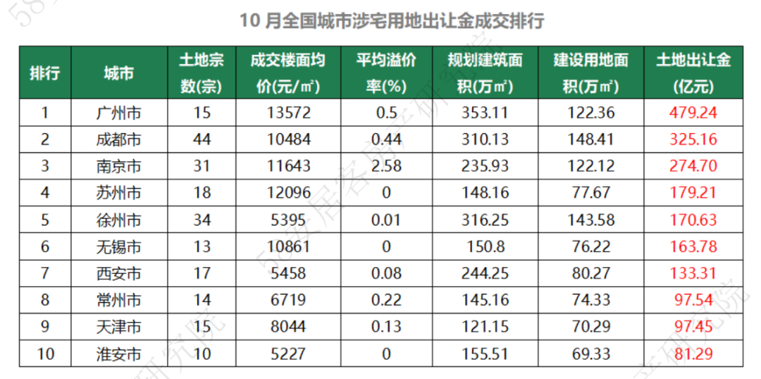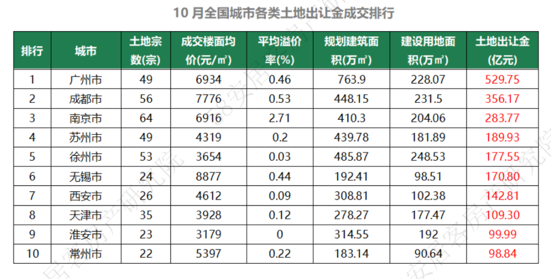 从10月全国城市各类土地出让金榜单看,广州、成都、南京、苏州、徐州、无锡、西安、天津8城在土地市场上投金超百亿。其中,广州、成都、南京、天津、徐州在本月完成了第三批次的集中供地,而无锡和苏州则已完成了第四批次的集中供地,直接拉动了成交金额的上扬。