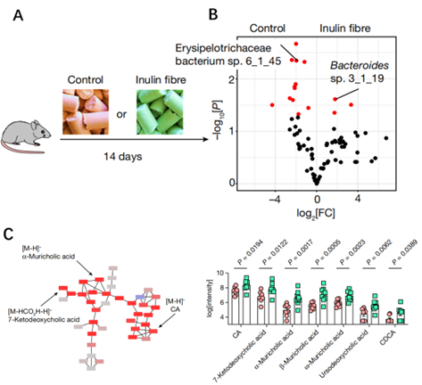 与已有临床研究结果一致,和对照组相比,菊粉组小鼠肠道中的拟杆菌丰度提高。血清代谢组学分析结果则显示,菊粉组小鼠血清中,酚类化合物水平显著下调、吲哚类化合物水平显著上调,而在其血清中水平最高且与对照组小鼠差异最大的代谢物是胆汁酸(BA)以及初级胆汁酸,即胆酸(CA)。