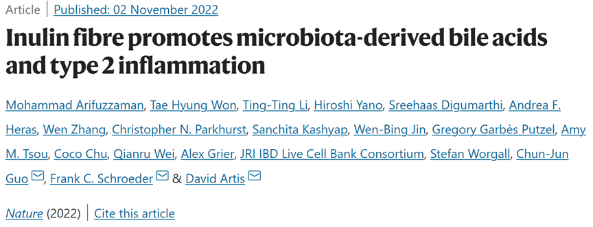 不仅如此,研究者们还将人类粪便移植给小鼠,探索菊粉对人体肠道菌群的影响。结果显示,所有被人类菌群定植的小鼠在摄入菊粉后,血清内胆汁酸水平上调,并且可以观察到炎症相关因子IL-33、IL-5水平升高、嗜酸性粒细胞增多。这意味着,菊粉也可通过作用于人类肠菌,来诱发2型炎症反应。