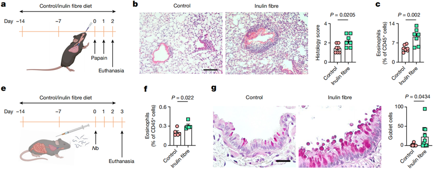 他们将小鼠暴露于过敏原(木瓜蛋白酶),诱发小鼠出现2型炎症以及肺部损伤。在给小鼠菊粉后发现,小鼠肺部炎症反应加重,肺血管以及支气管周围区域的炎症细胞浸润增加,且肺和肺泡中嗜酸性粒细胞水平显著升高。