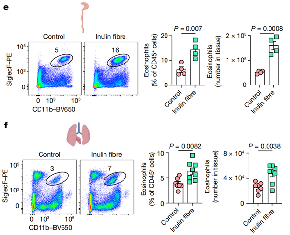 研究者们发现,与对照组相比,菊粉组小鼠肠道内的大多类型免疫细胞数量没有明显改变, Treg细胞数量略有增加,而嗜酸性粒细胞水平显著升高。不仅如此,菊粉组小鼠的肺部也富集有嗜酸性粒细胞。