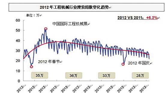 2012年工程机械行业日均搜索指数为32.6万,同比增长5.2%。受元旦和春节假期影响,工程机械行业搜索指数在1月份为全年低谷;受到3月中国国际工程机械展影响,搜索量在3月达到全年峰值;此外,网民在国庆假期的搜索量较低。
