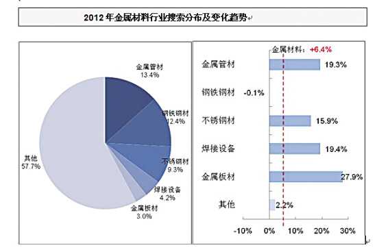 2012年,金属材料行业搜索量增长最高的细分行业为金属板材、焊接设备、金属管材和不锈钢材,增长率分别达到27.9%、19.4%、19.3%和15.9%,远高于金属材料行业6.4%的增长幅度。