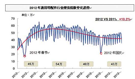 2012年通用零配件行业日均搜索指数为47.2万,与2011年相比增长10.2%。3月份达到全年的峰值,此后搜索量微幅下降。