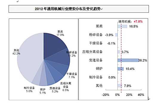 2012年,通用机械行业搜索量增长速度最快的细分行业为变速设备,幅度高达36.2%;泵类和锅炉搜索量同比增长16.5%和10.4%,增幅均高于通用机械行业平均水平。