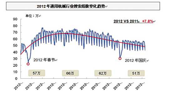 2012年通用机械行业日均搜索指数为58.4万,与2011年相比增长7.8%。网民在春节和国庆假期对通用机械行业搜索度最低,全年搜索高峰出现在第二季度,第三、四季度出现缓慢下滑。
