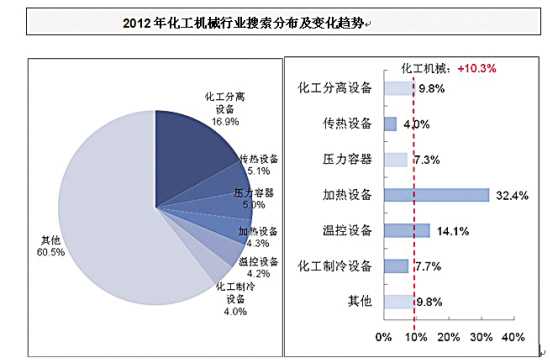 2012年,化工机械行业搜索量增长最高的细分行业为加热设备,增幅达到32.4%,温控设备增长幅度为14.1%。