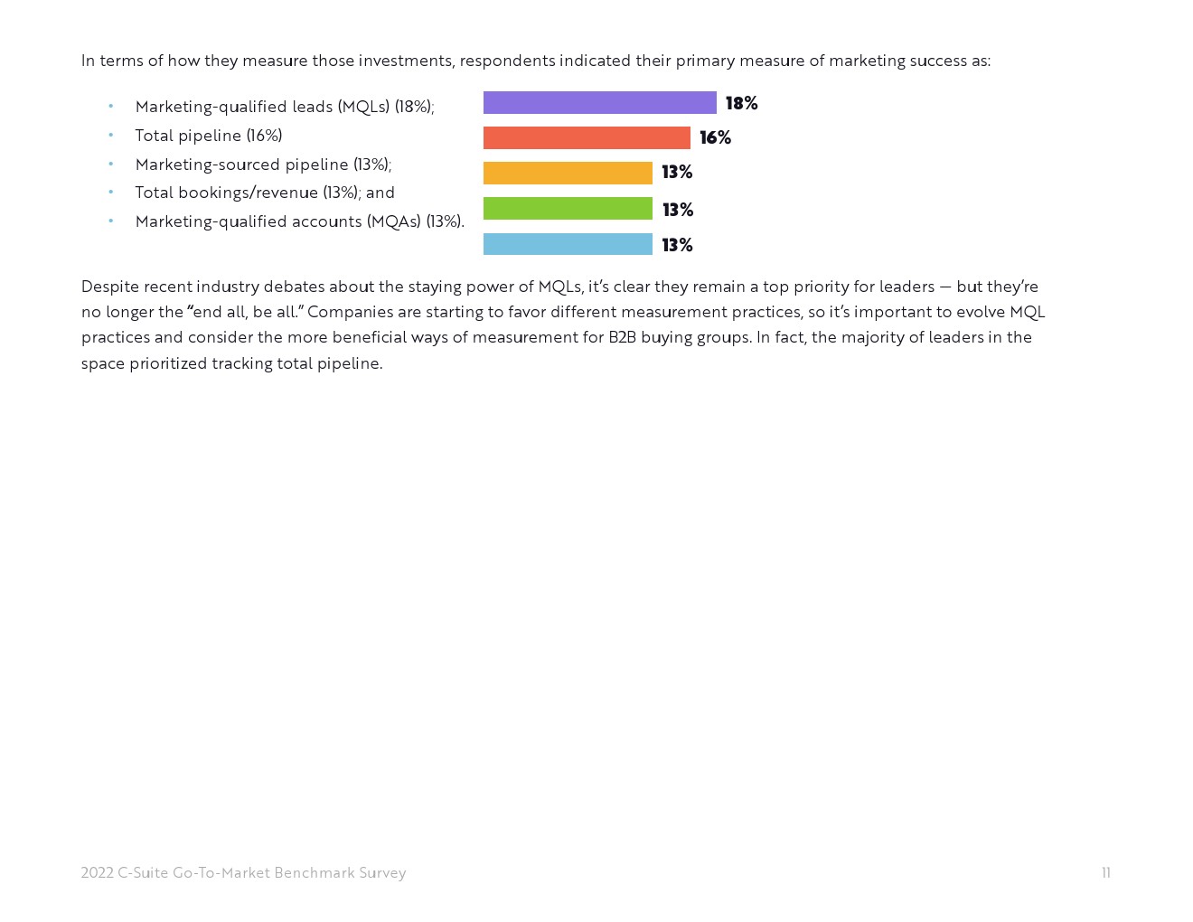 最常见的测量方法是合格的潜在客户(MQL,占18%),其次是总渠道(16%)、营销来源渠道(13%)、总预订/收入(13%)和营销合格客户(MQA,13%)。