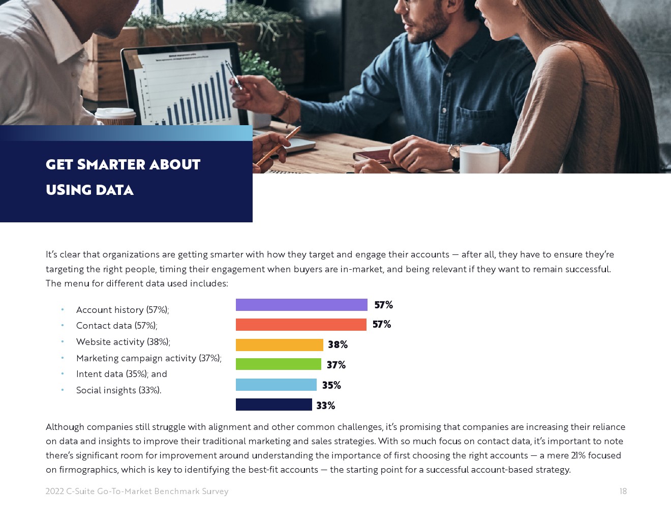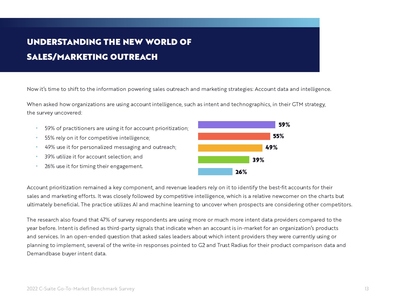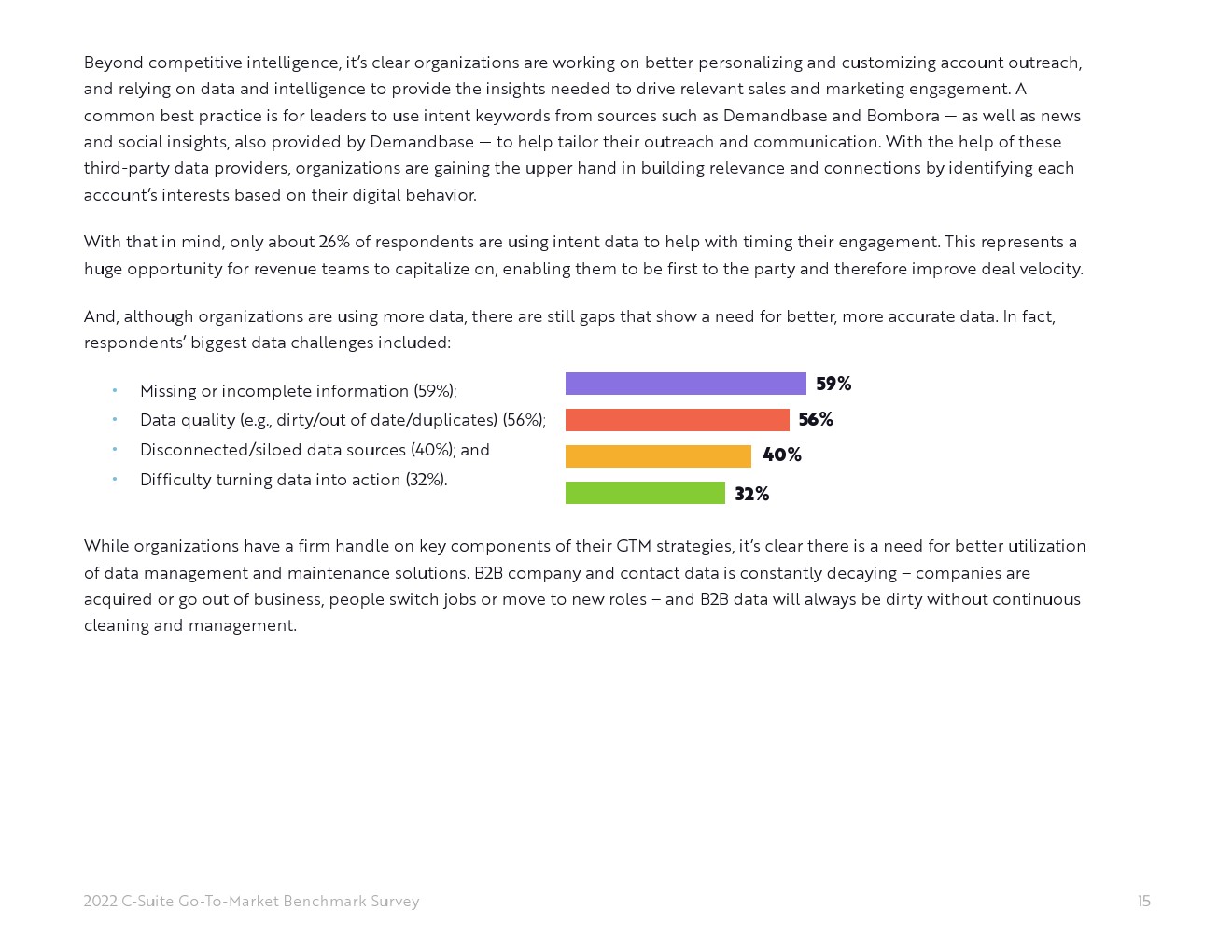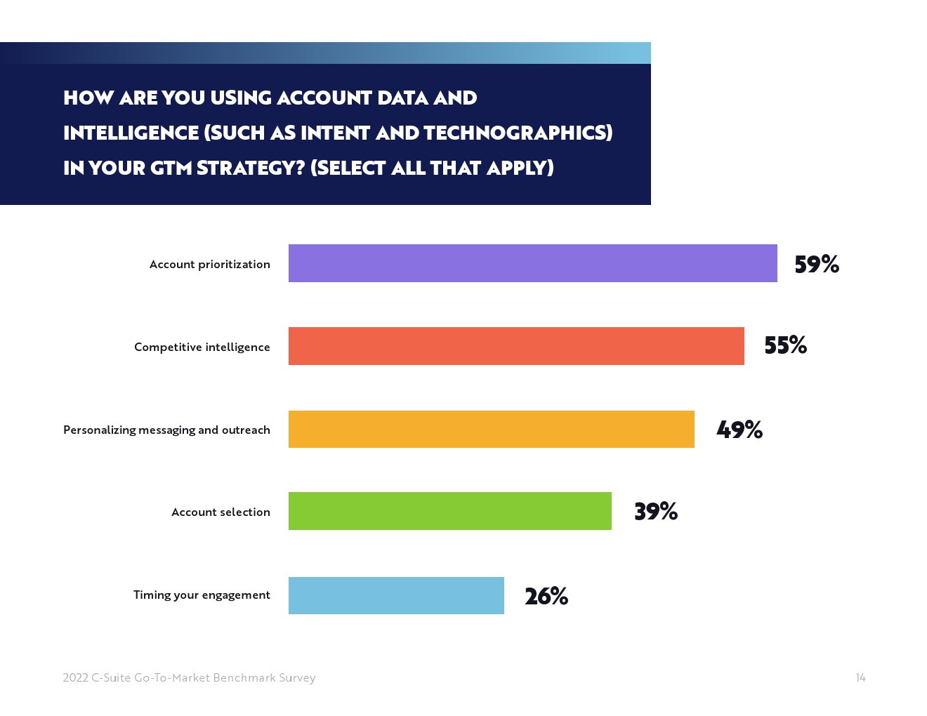 当被问及企业如何在其GTM战略中使用客户情报(包括意图数据和技术图表)时,59%的企业将其用于客户优先级排序,55%的企业依赖于客户情报进行竞争,49%的企业使用客户情报进行个性化消息传递和外联,39%的企业利用客户情报来提供选择,26%的企业转向客户情报来确定其参与时间。
