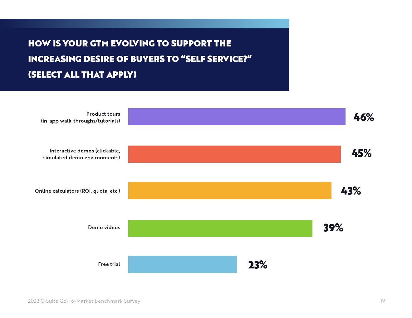 整个行业正趋向于支持自助式旅程,受访者表示他们正在发展GTM。这样的努力——如产品巡演(应用内演练/教程46%)、交互式演示(45%)、ROI、配额等在线计算器(43%)和演示视频(39%)——现在很重要,将来也会更重要。