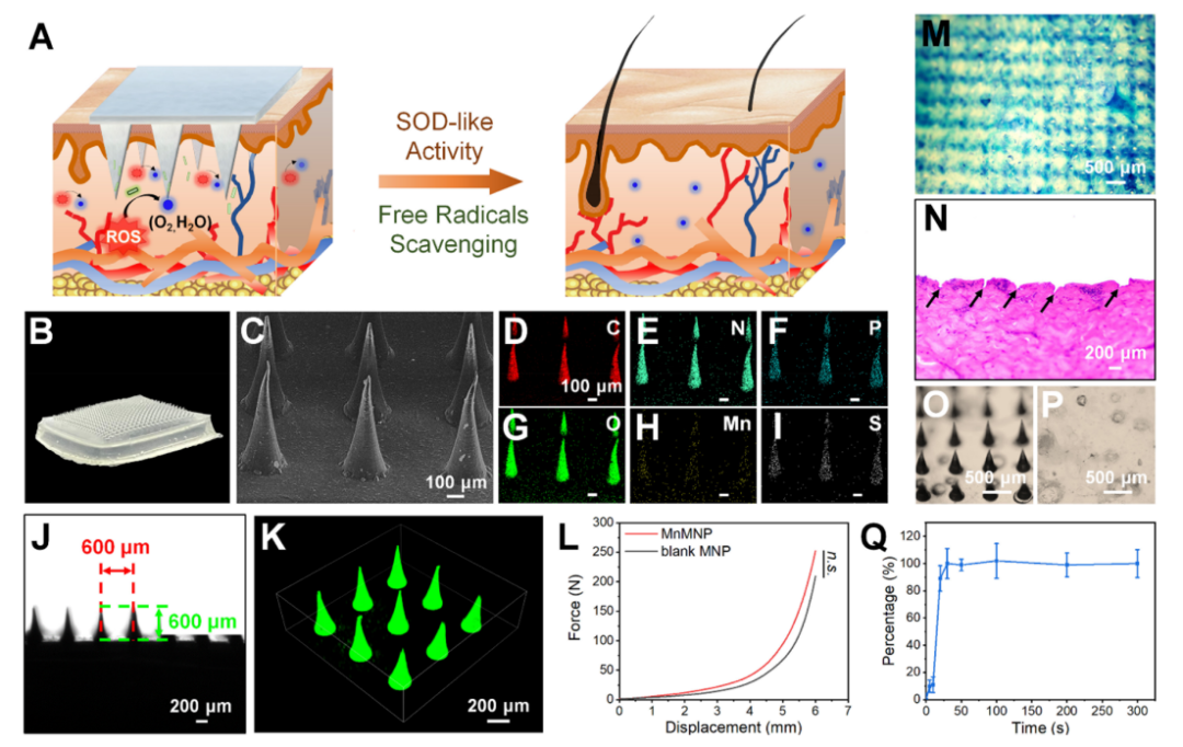 然后,研究人员构建了一个微针贴片(MNP),它可以通过安全通道直接将货物送入HFs所在的表皮和真皮区域,这是一个由透明的MnPS3集成的20×20微针阵列贴片,其形状为圆锥形,Mn、P和S元素在MNP中均匀分布,而MNP中的C、N和O元素来自透明质酸(HA),实验结果显示MNP可以穿透表皮屏障并成功传递MnPS3,同时研究人员还测试了该MNP的释放效果,发现MnMNP的释放曲线呈现出爆发式的释放特征。在30秒内,89%的MnPS3从MnMNP中快速释放,50秒后,达到最大释放量(如图二),同时,在对人体皮肤成纤维细胞的初步测试中,这种贴片显著降低了活性氧的水平,且不会造成伤害。