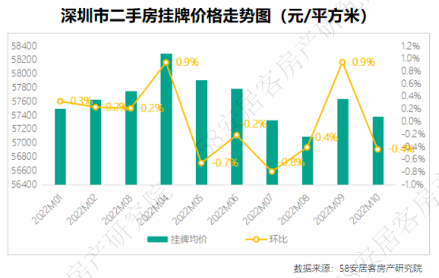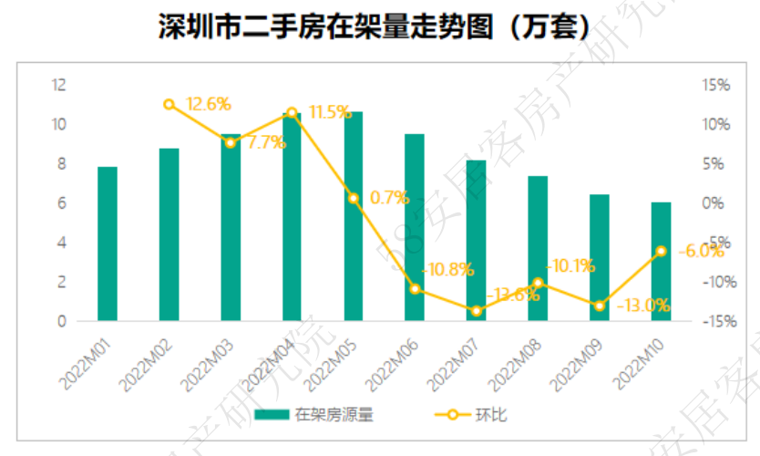 10月,深圳市二手房挂牌量环比减少6.0%,挂牌量已连续五个月出现大幅回落。