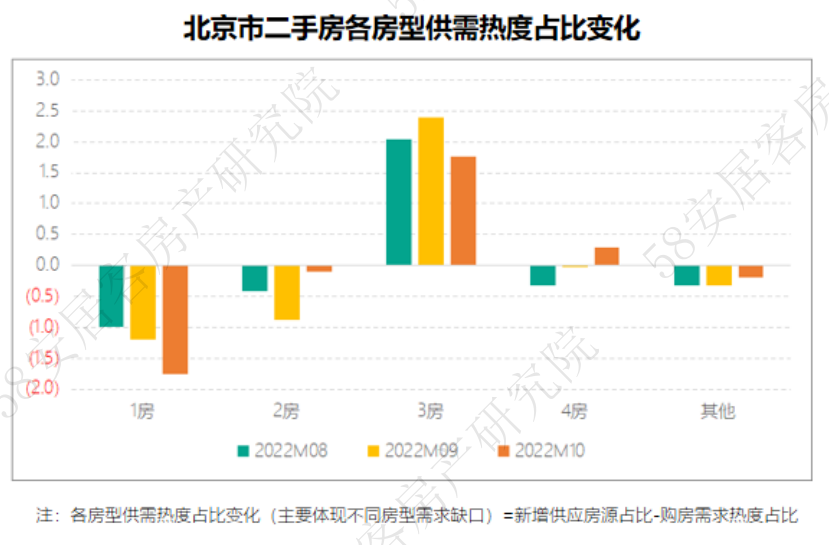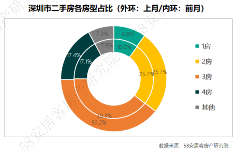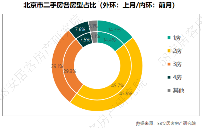 其中两房出现一定明显提升,占比增加0.4个百分点,而中大型房源占比全部出现回落。