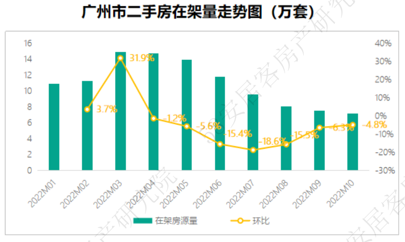 10月,广州市二手房挂牌量环比下跌4.8%,已连续七个月出现回落。由于房源信息的整合,房源真实性提升是房源持续减少的主要原因。