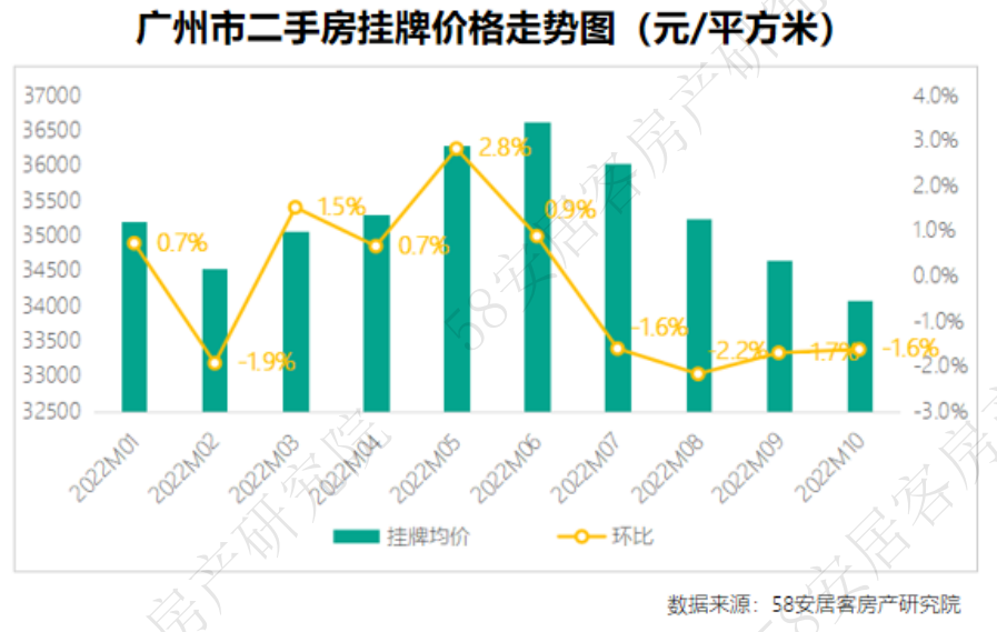 10月,广州市二手房挂牌均价为34095元/平方米,环比下跌1.6%。广州市二手房挂牌持续出现深度调整,与当前城市成交低迷相关,房东只能通过降低挂牌价格从而获得出售的机会,预计房价还有持续调整可能性。