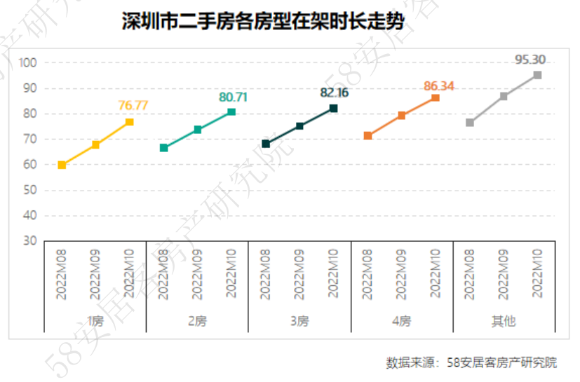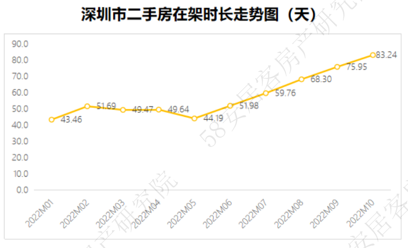 10月,深圳市二手房在架时长为83.24天,环比再次大幅增加9.6%。成交量持续处于历史低位徘徊,购房者观望气氛浓郁,影响房源的销售速度。