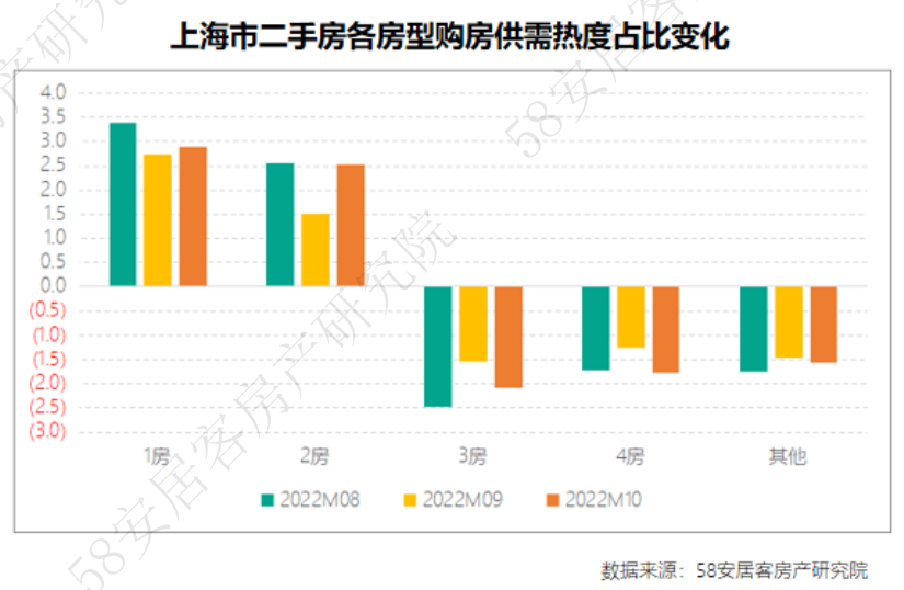 10月,上海市二手房各房型中,小户型房源新增挂牌量高于购房需求热度占比,基本处于新增供应能够满足需求。而其他中大户型房源基本上购房需求热度会相对较高。