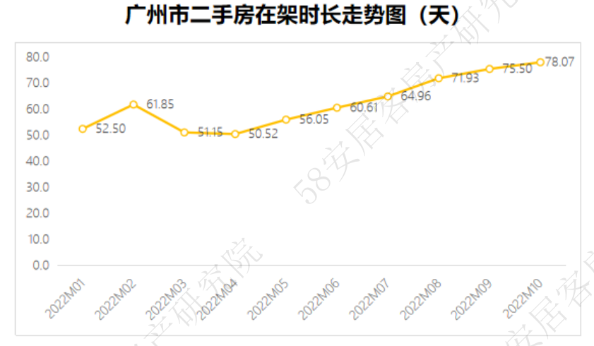 10月,广州市二手房在架时长为78.07天,环比上涨3.4%。广州市二手房在架时长持续出现上涨,时长持续处于筑底阶段,导致购房者持续观望。