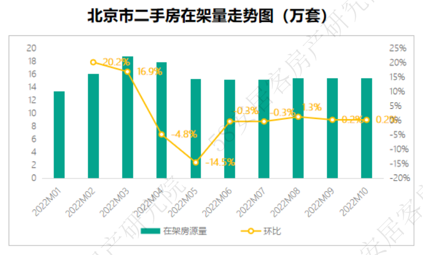 10月,北京市二手房在架房源量环比增加0.2%,与上月基本持平,北京市二手房挂牌量已连续6个月维持在15万套出头的水平。