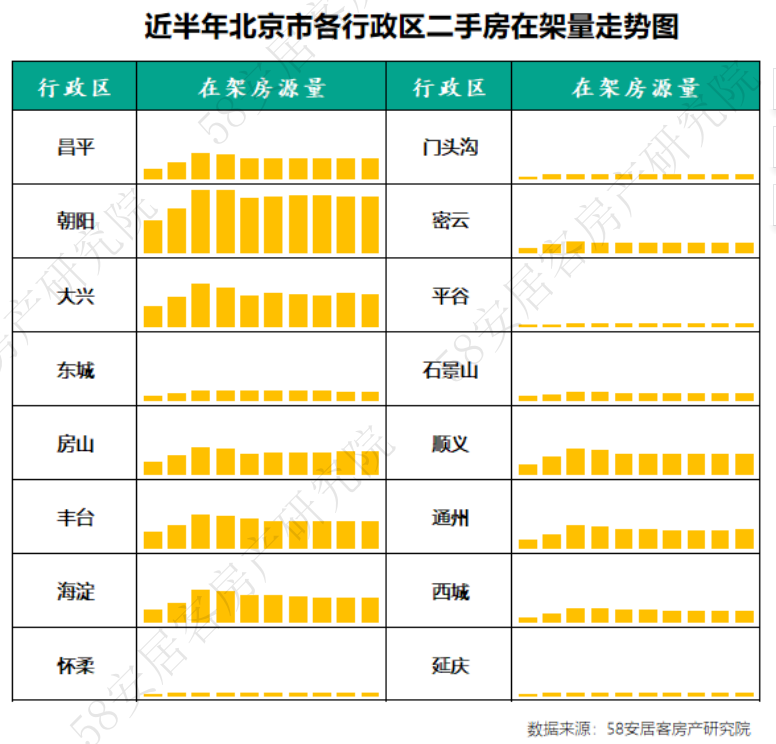 从各行政区的二手房在架时长走势来看,密云、房山和顺义三个行政区的二手房挂牌时长出现回落,其他各行政区都出现了不同程度的上涨。