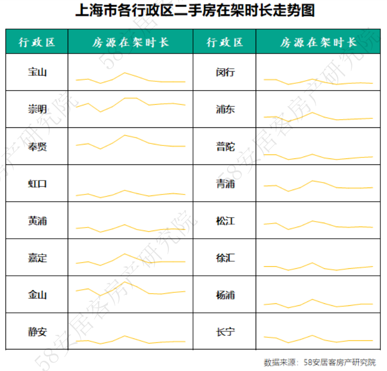 从区域二手房在架时长来看,浦东、青浦、普陀、徐汇和金山出现上涨,其他区域都出现不同幅度的回落。