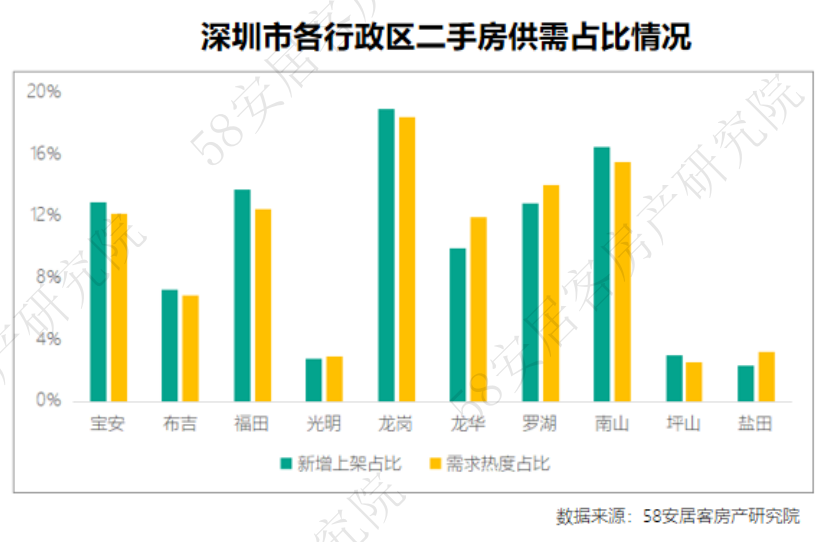 10月,深圳市各行政区二手房供求热度来看,各区域基本上处于相对平衡的状态,新增挂牌和购房需求热度差距相对较小。