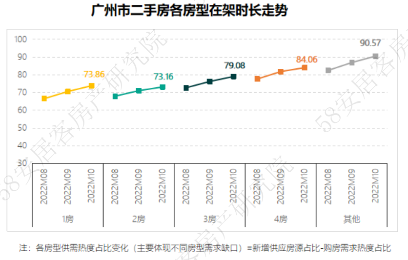 10月,广州市各房型二手房在架时长都出现了上涨,1房和大户型房源涨幅相对最大,都超过了4%的涨幅。从目前广州市的二手房市场来看,各户型在架时长差距相对其他几个一线城市而言差距不大。