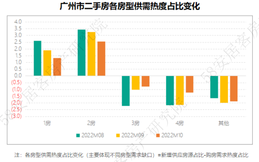 10月,广州市二手房各房型中,1房和2房这类小户型房源新增供应占比会明显少于购房需求热度占比,不过从近三个月的趋势来看,逐步区域平衡。中大户型新增房源占比相比需求热度占比会略少一些,处于相对的供需矛盾的状况。