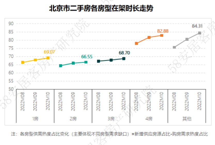 10月,北京市二手房各房型在架时长都出现了上涨,其中大户型房源涨幅最大,为4.77%,并且超过了4房的在架时长。而两房的在架时长涨幅相对最小,为0.93%。北京市中小户型在架市场相对涨幅较小,主要还是购房需求已刚需为主。