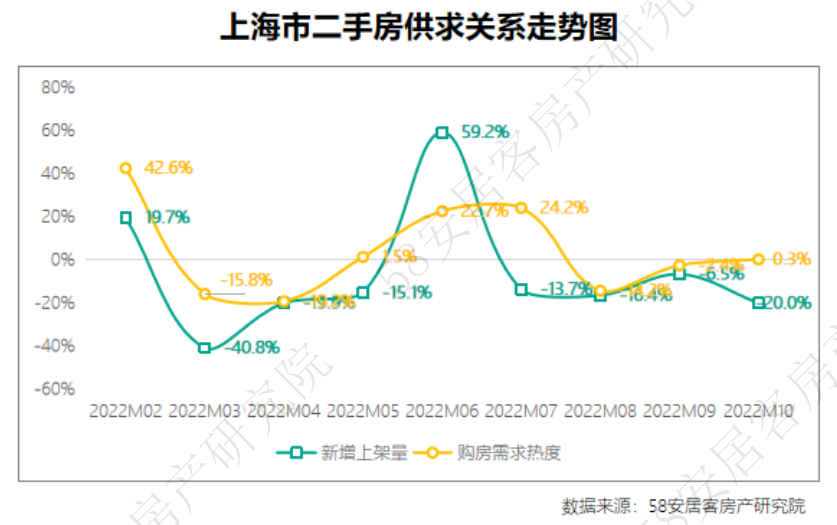 10月,上海市二手房新增上架量环比减少20%,其中购房需求热度环比上涨0.3%。其中,新增上架房源环比出现大幅调整,比今年4、5月份疫情期间还要大,即使是出台了购房退税政策也无法激起房东挂牌意愿,主要还是与当前市场持续调整相关。