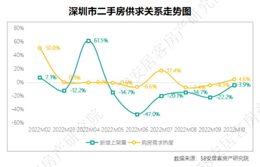 10月,深圳市二手房新增上架量环比减少3.9%,购房需求热度环比上涨4.6%。当前深圳的二手房市场成交量基本上已经处于跌无可跌的状态,并且房价也开始出现下跌,购房者逐渐进入市场看房带动热度上升。