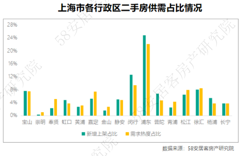 10月,上海市各行政区二手房供需关系来看,浦东和闵行的新增供应量占比明显大于需求的占比,五大新城所在区域的嘉定、奉贤、青浦、松江这些区域的购房需求热度会大于新增挂牌房源占比。