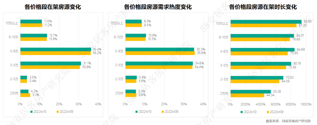 从各价格段的在架时长来看,出现了不同幅度的增加,市场逐步进入调整期影响在架时长的上涨。
