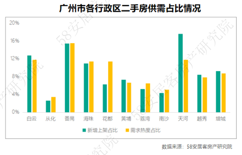 10月,广州市各行政区二手房供需热度来看,花都的购房需求热度占比明显高于区域新增挂牌房源占比,而天河的新增挂牌房源占比相比购房需求热度却是明显多了不少。