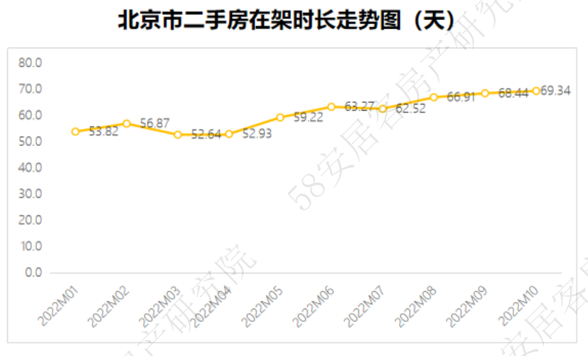 10月,北京市二手房在架时长为69.34天,环比增加1.3%。北京市二手房在架时长在春节过后出现回落之后,基本上持续处于上涨的态势,整体观望气氛浓郁。