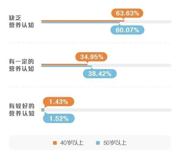 对于营养知识的缺失是制约受访者摄取合理膳食的原因之一。调查发现,40岁以上与50岁以上的受访者中,有较好营养认知的仅占1.43%和1.52%。同时,他们对慢病症状、诱因和干预的认知也不够。只有不到四分之一的受访者有较好的慢性病认知。