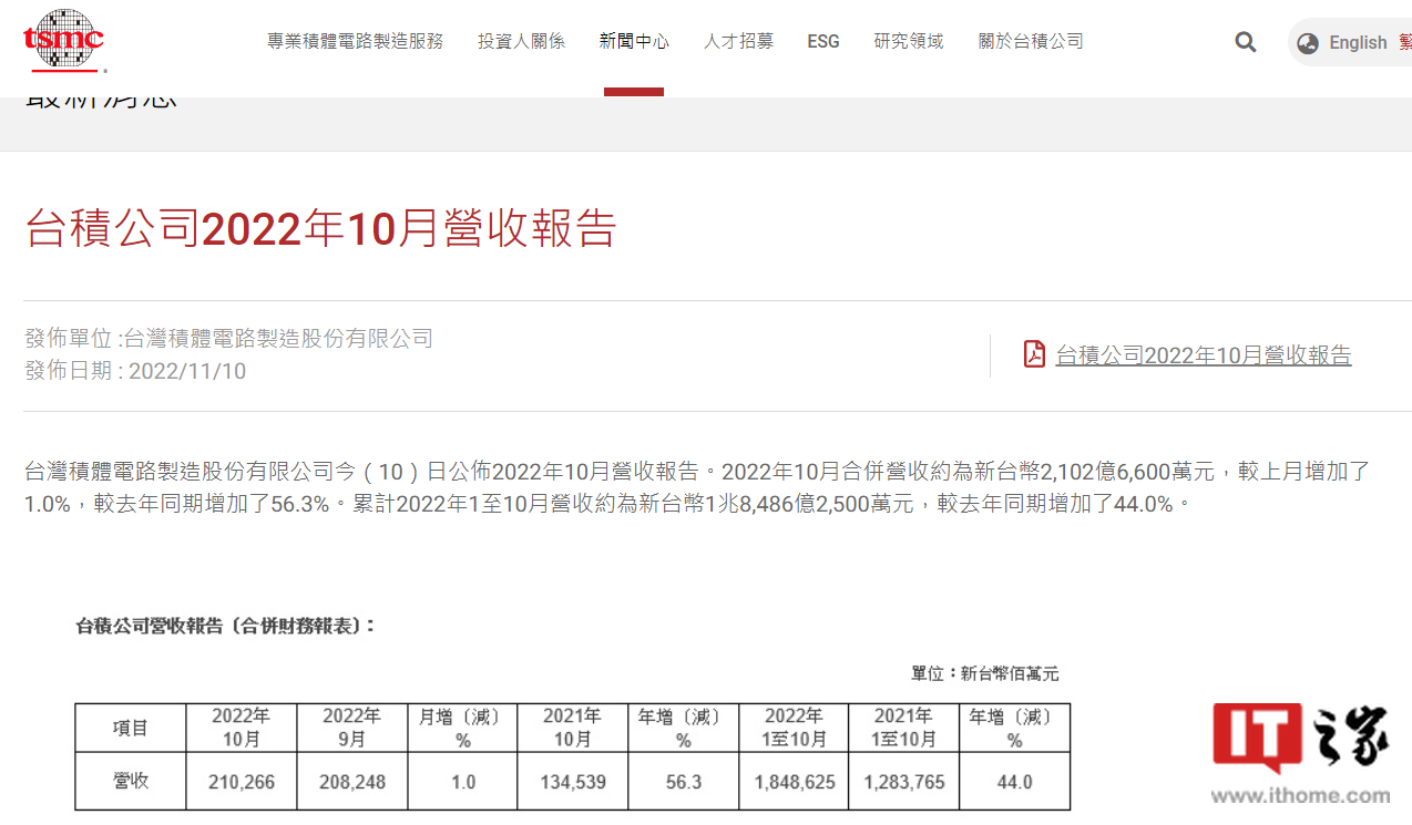 台积电今日发布了 2022 年 10 月营收报告。10 月合并营收约为 2102.66 亿元新台币(约 479.41 亿元人民币),较上月增加了 1.0%,较去年同期增加了 56.3%。台积电 2022 年 1 至 10 月累计营收约为 1.85 万亿元新台币(约 4218 亿元人民币),较去年同期增加了 44.0%。