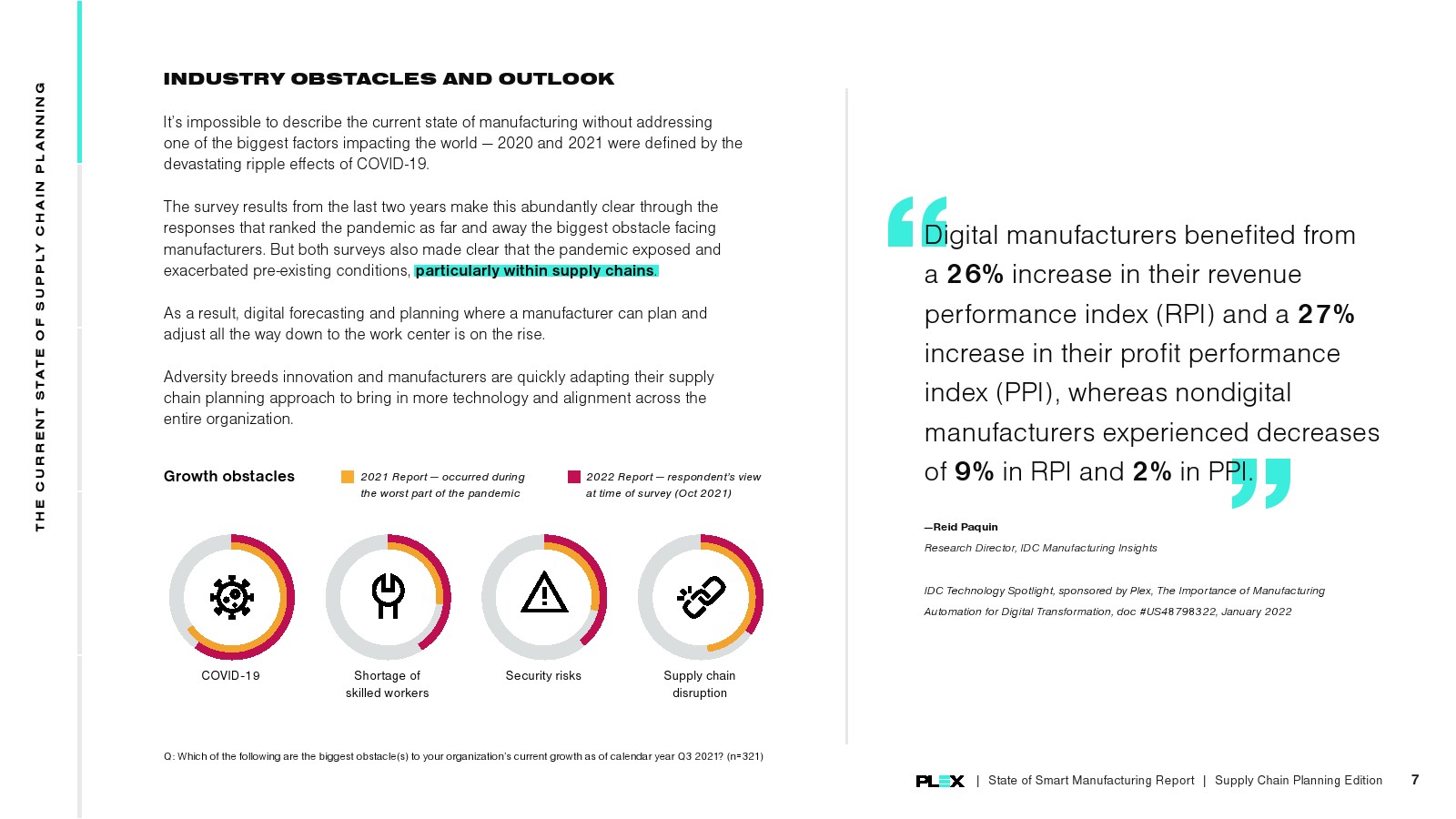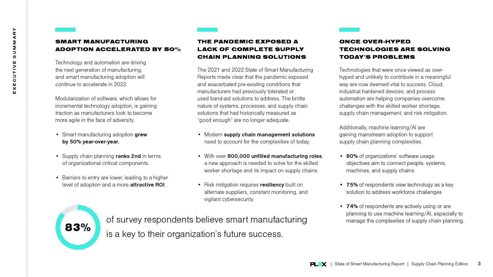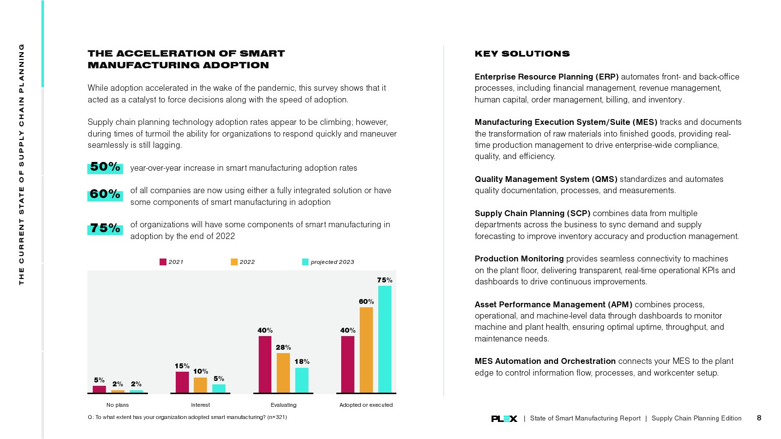 Plex发布了“2022年智能制造报告”,揭示了制造商在供应链危机中面临的持续挑战,以及重新控制关键商品、供应商寿命、技术创新和物流复杂性的努力。这项研究调查了321家全球制造商,了解他们的敏捷性、技术采用和改进流程的需求,以应对市场逆境。