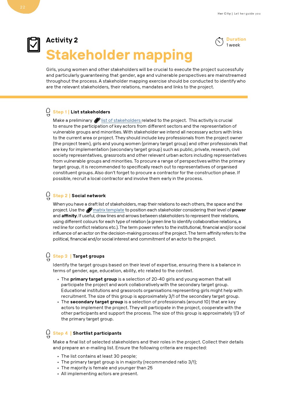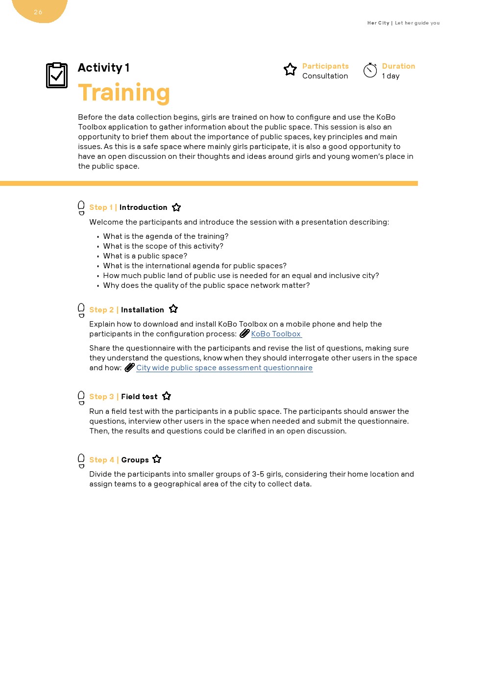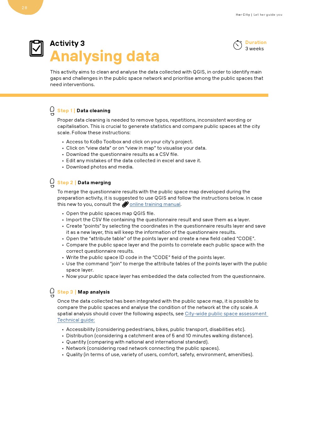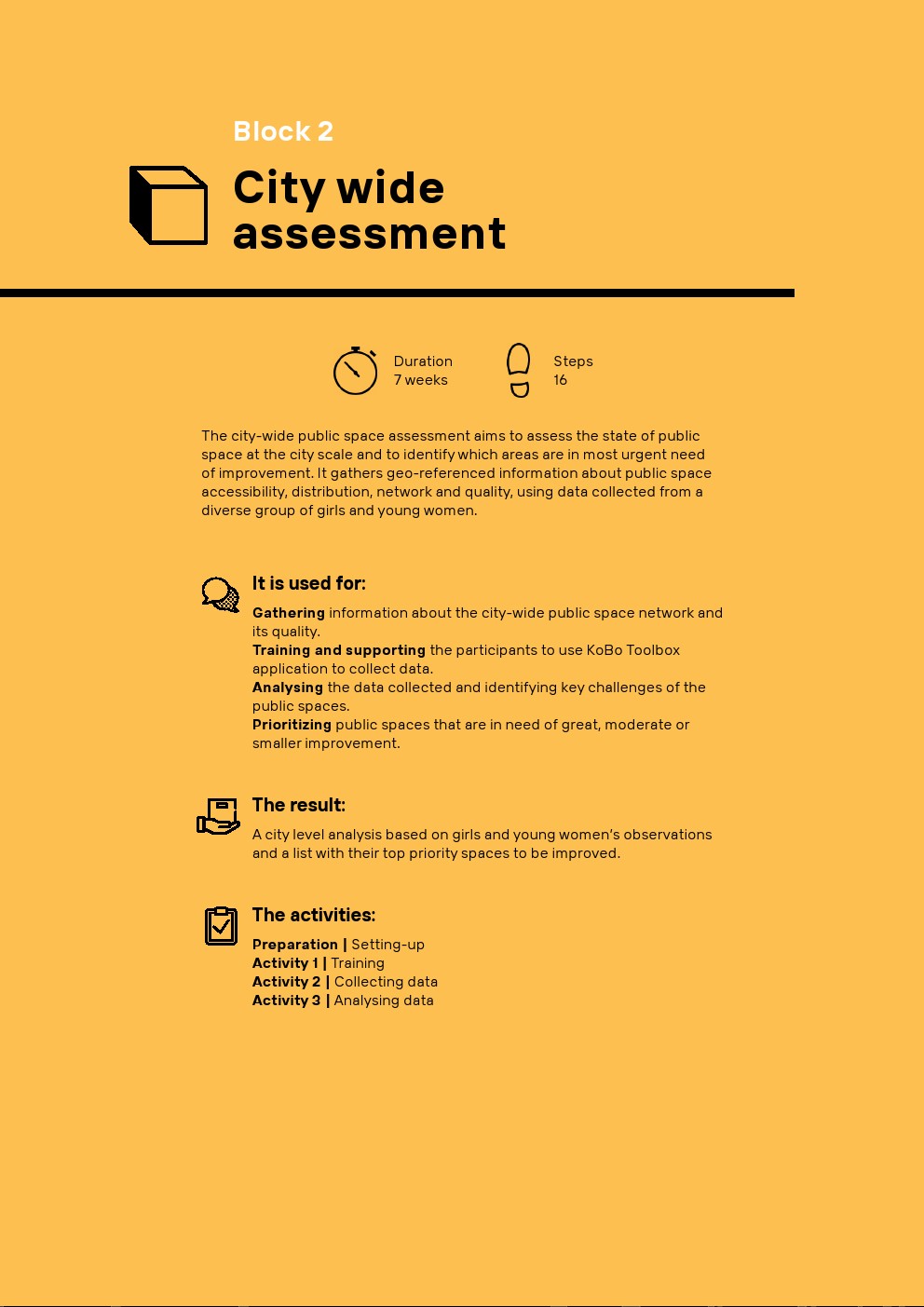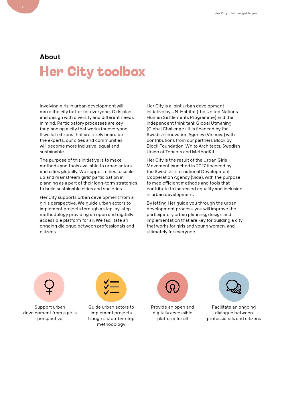 “她的城市”提供了一个更大规模建设能力的机会。她的城市为市政专业人员、城市居民和地方决策者提供了一个坚实的工具箱,通过战略性地让女孩和年轻妇女参与城市规划和设计,将青年、性别和社会经济观点纳入主流。