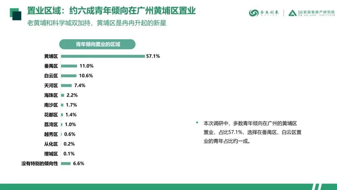 本次调研中,约六成黄埔青年倾向在广州黄埔区置业。追求稳定的居所是青年们置业的主要原因,也有超半数的青年购房为了房产保值/有升值空间。